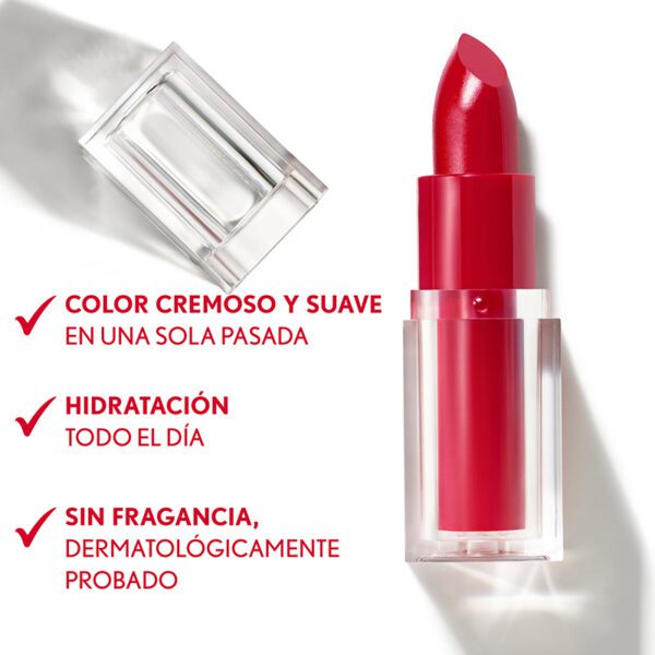 Elaborado con el mínimo de ingredientes para un color clean e intensamente hidratante. Basado en un estudio al consumidor de 100 mujeres después de una semana de uso: 98% estuvo de acuerdo en que el labial ofrece una alta pigmentación. 96% estuvo de acuerdo en que el labial tiene una textura ligera. 94% estuvo de acuerdo en que los labios no se resecan. 94% estuvieron de acuerdo en que los labios se sienten suaves. 93% recomendaría el producto a un amigo.