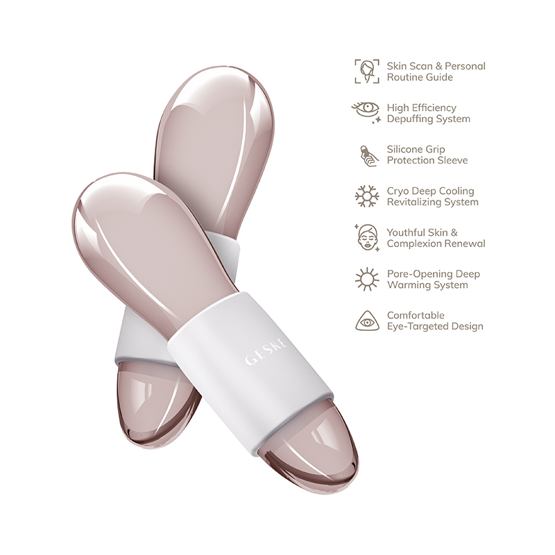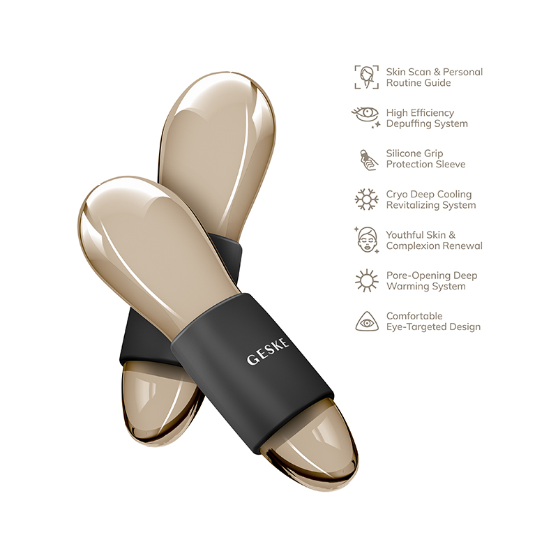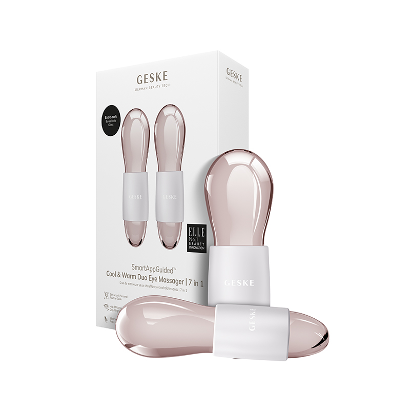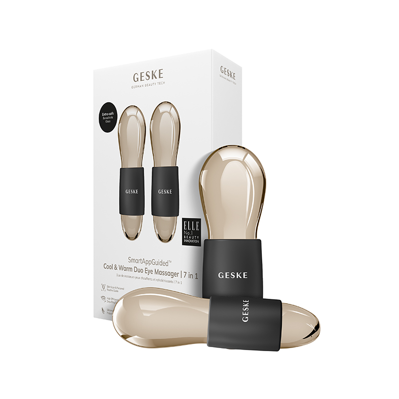 Dile adiós a las ojeras, bolsas y signos de cansancio con el SmartAppGuided™ Cool & Warm Duo Eye Massager | 7 in 1 de GESKE. Gracias a su innovador diseño con cristal de borosilicato y funda protectora de silicona, combina frío y calor para revitalizar el contorno de ojos, mejorar la circulación y devolverle a tu piel un aspecto fresco y luminoso.