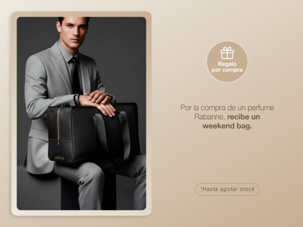 Por la compra de una fragancia en la marca Rabanne, recibe gratis un Million Gold Him Weekend Bag
