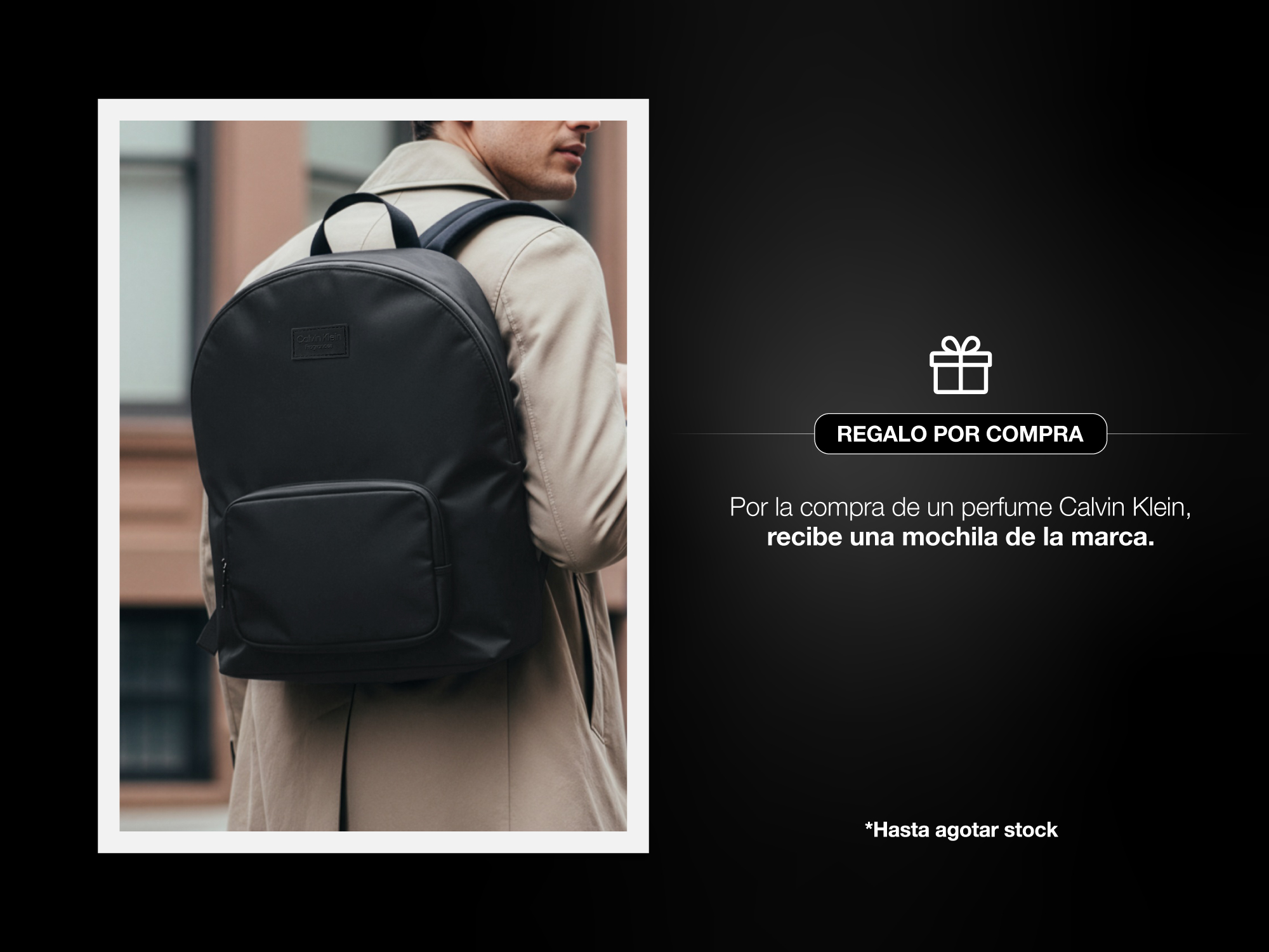 Por la compra de una fragancia en la marca Calvin Klein, recibe gratis una mochila.