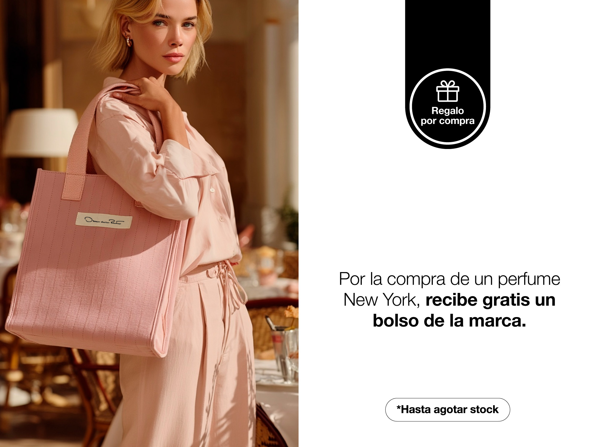 Por la compra de una fragancia New York en la marca Oscar De La Renta, recibe gratis un bolso.